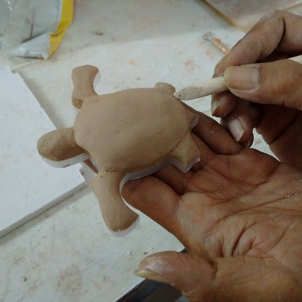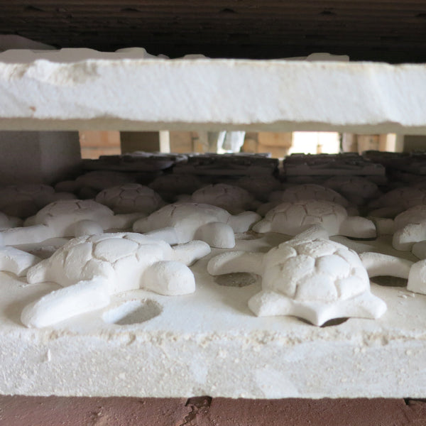 Dry clay is kiln fired to 900°C into bisque, which is less fragile to handle, but still provide a great surface for coloring.